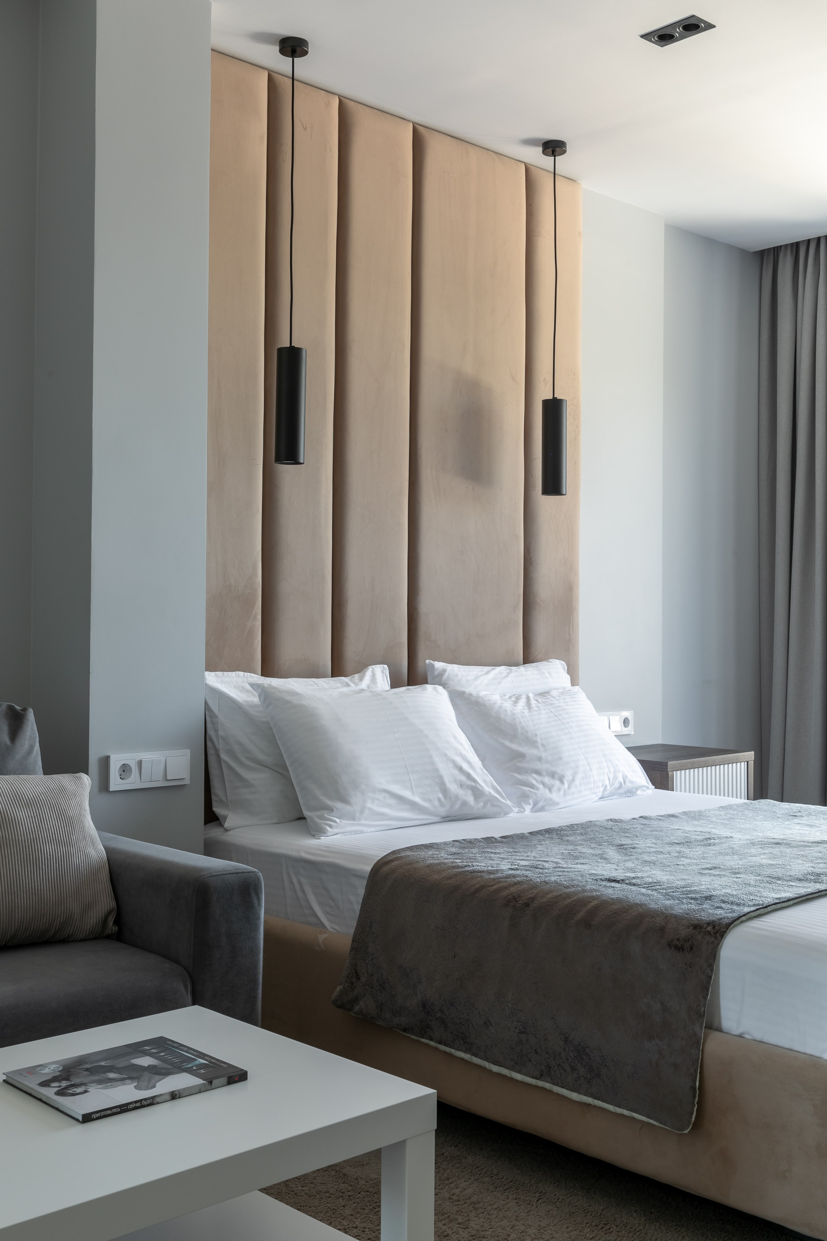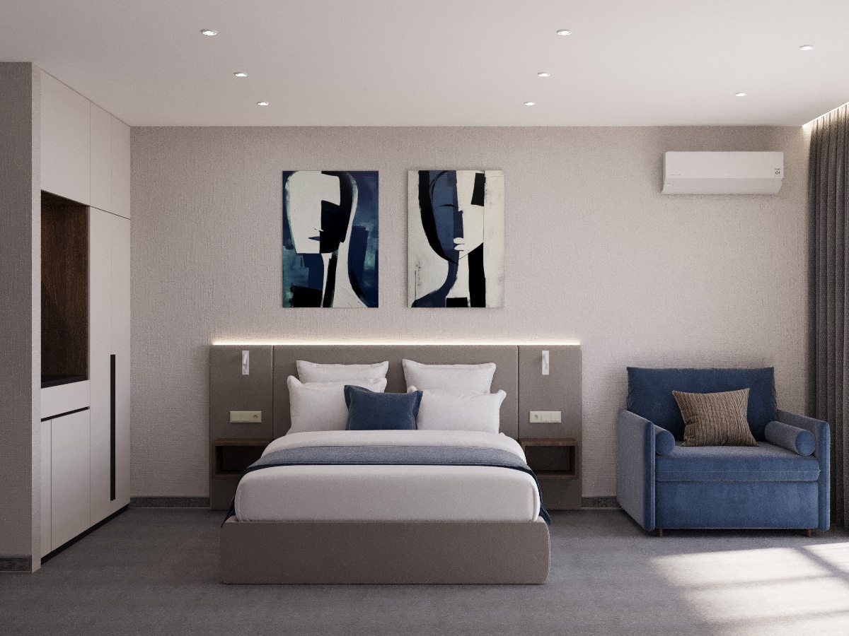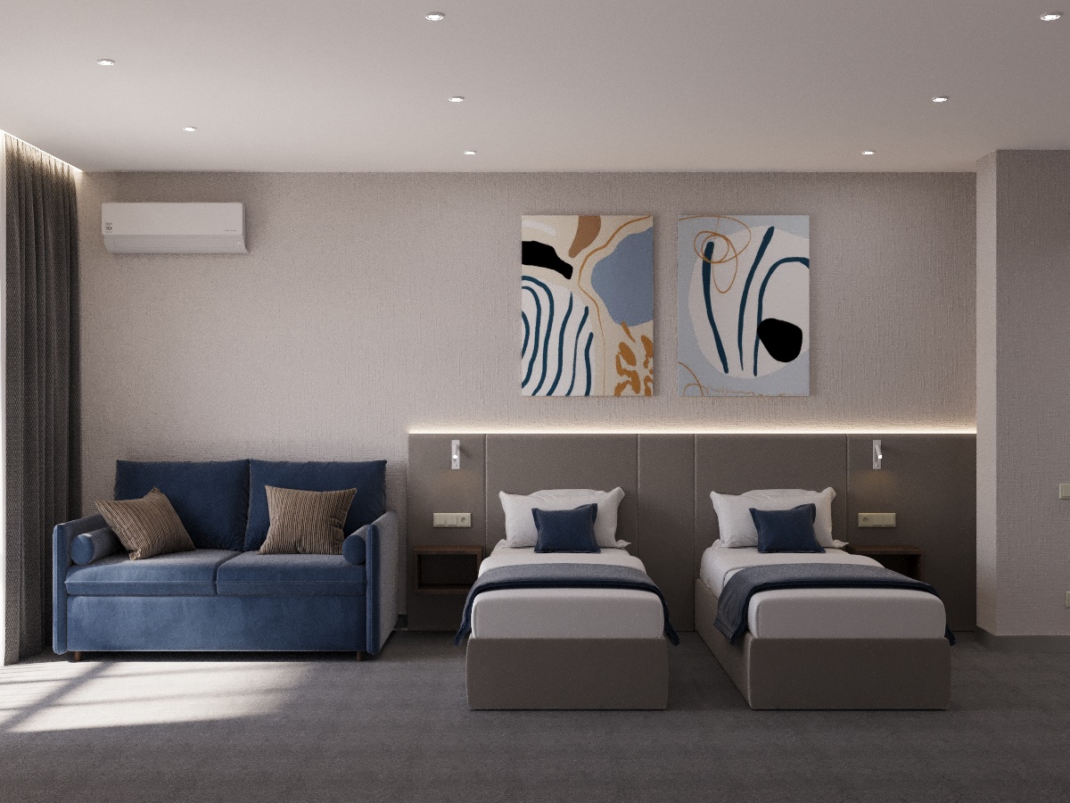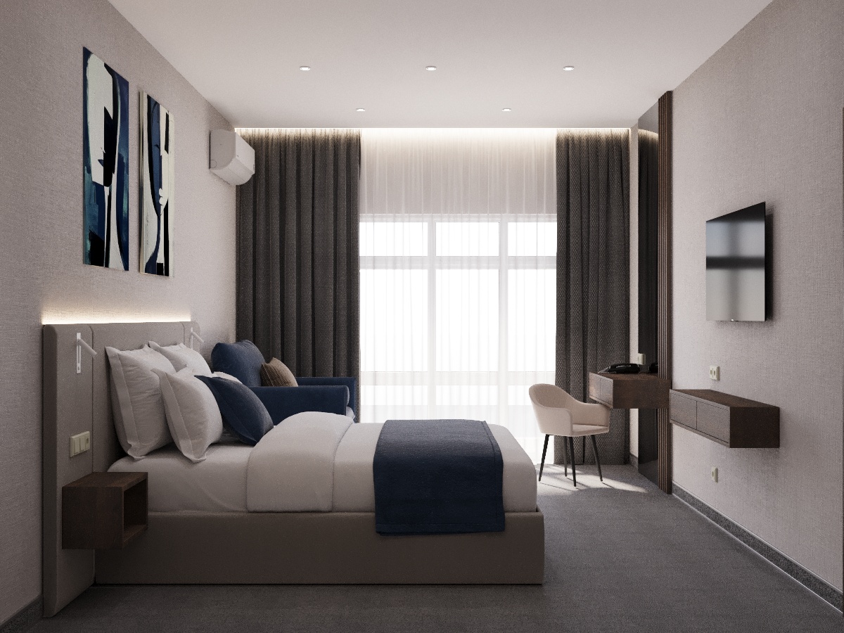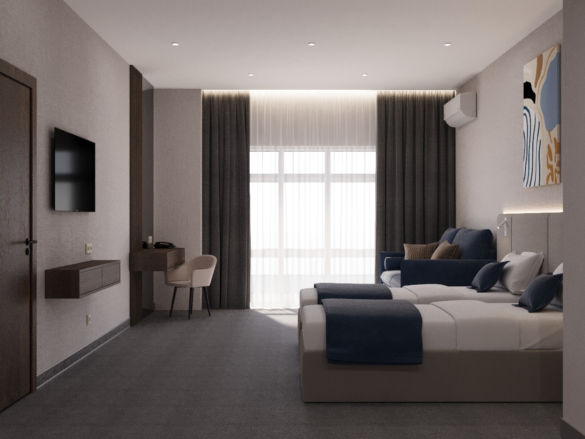 Просторный однокомнатный номер с современным интерьером находится в корпусе № 2 (8-ми этажное здание пансионата).