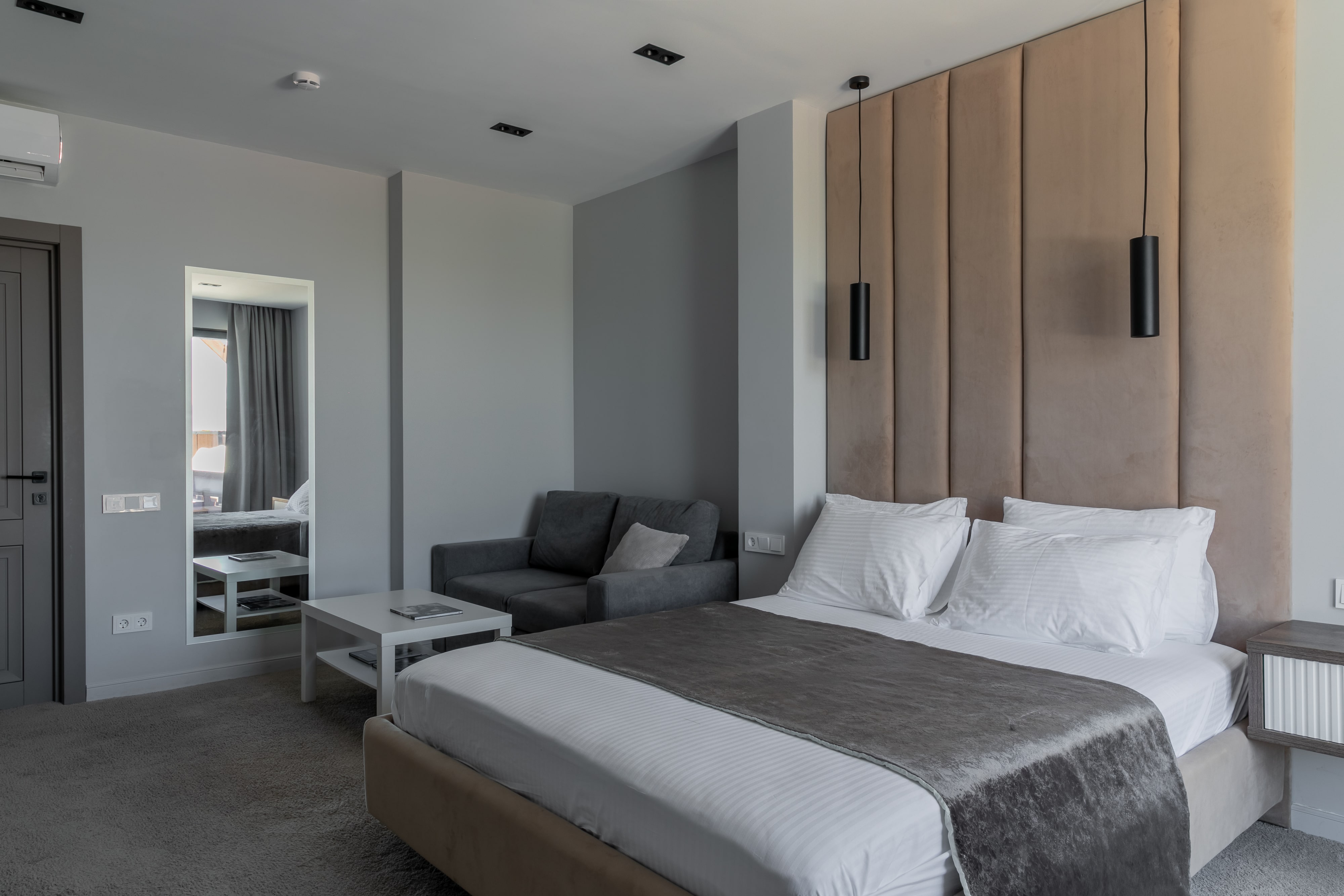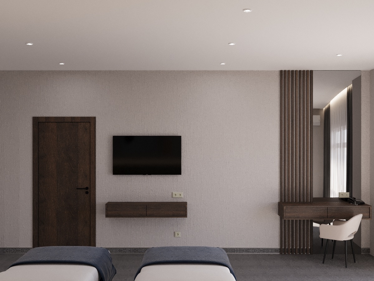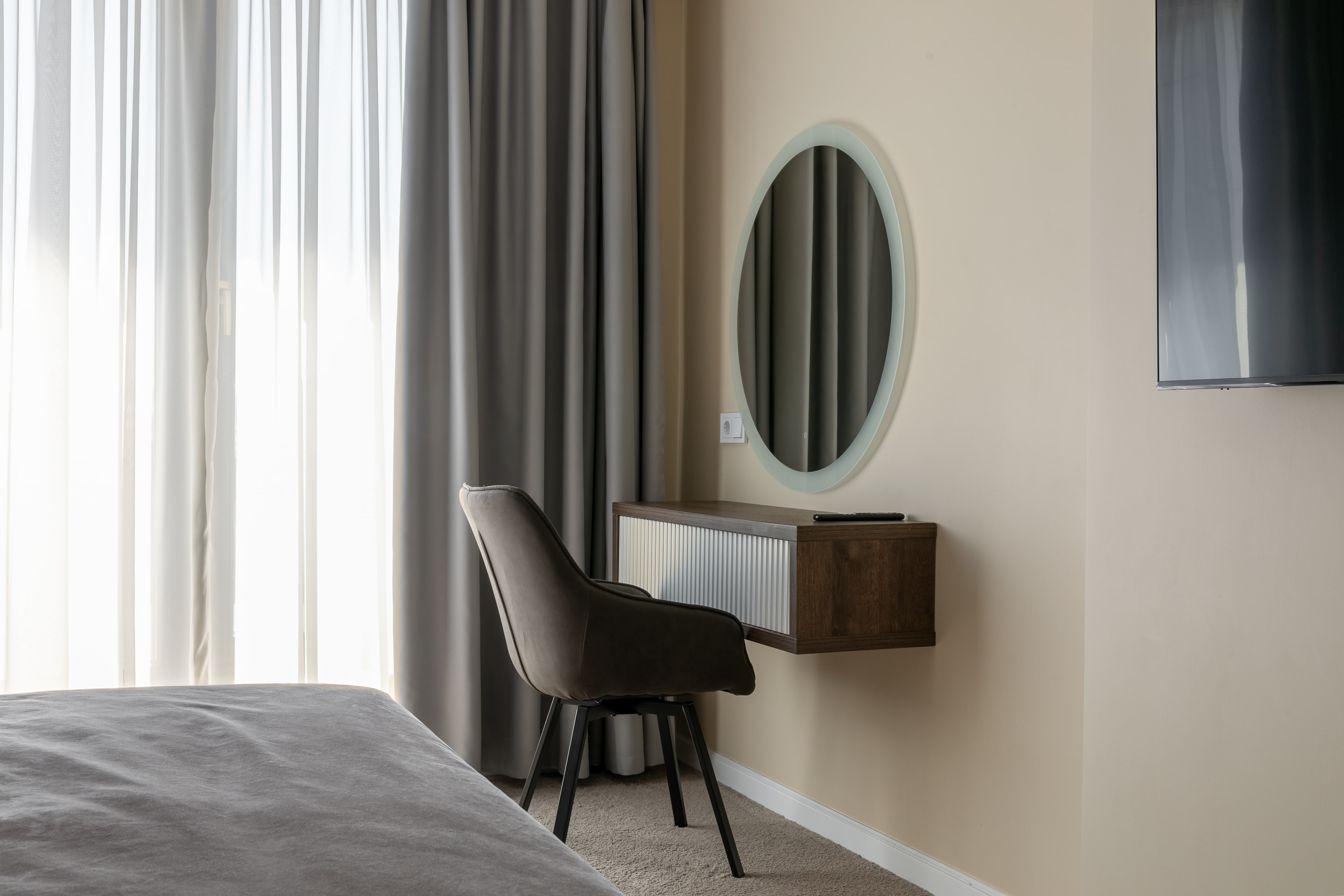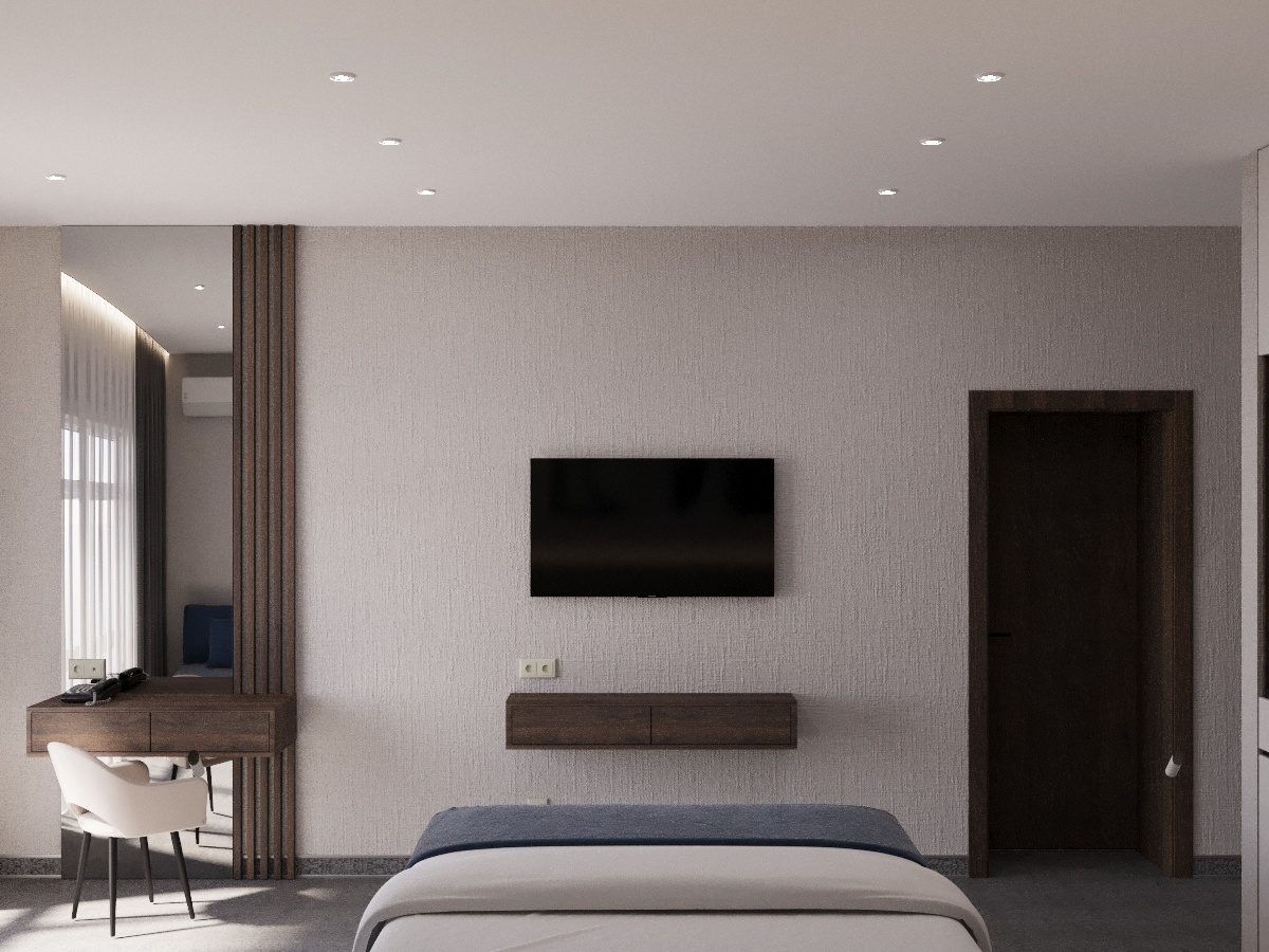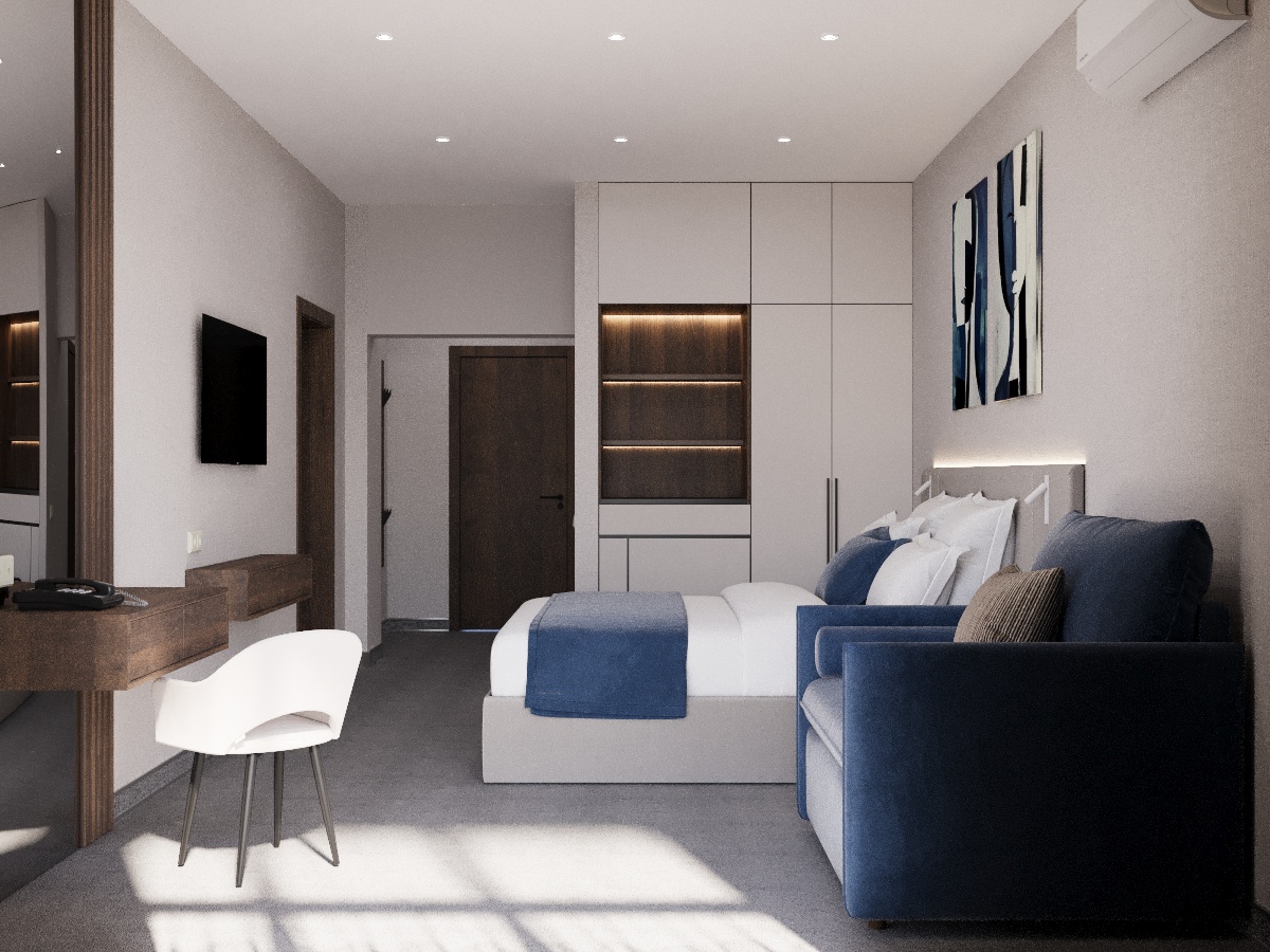 Просторный однокомнатный номер с современным интерьером находится в корпусе № 2 (8-ми этажное здание пансионата).