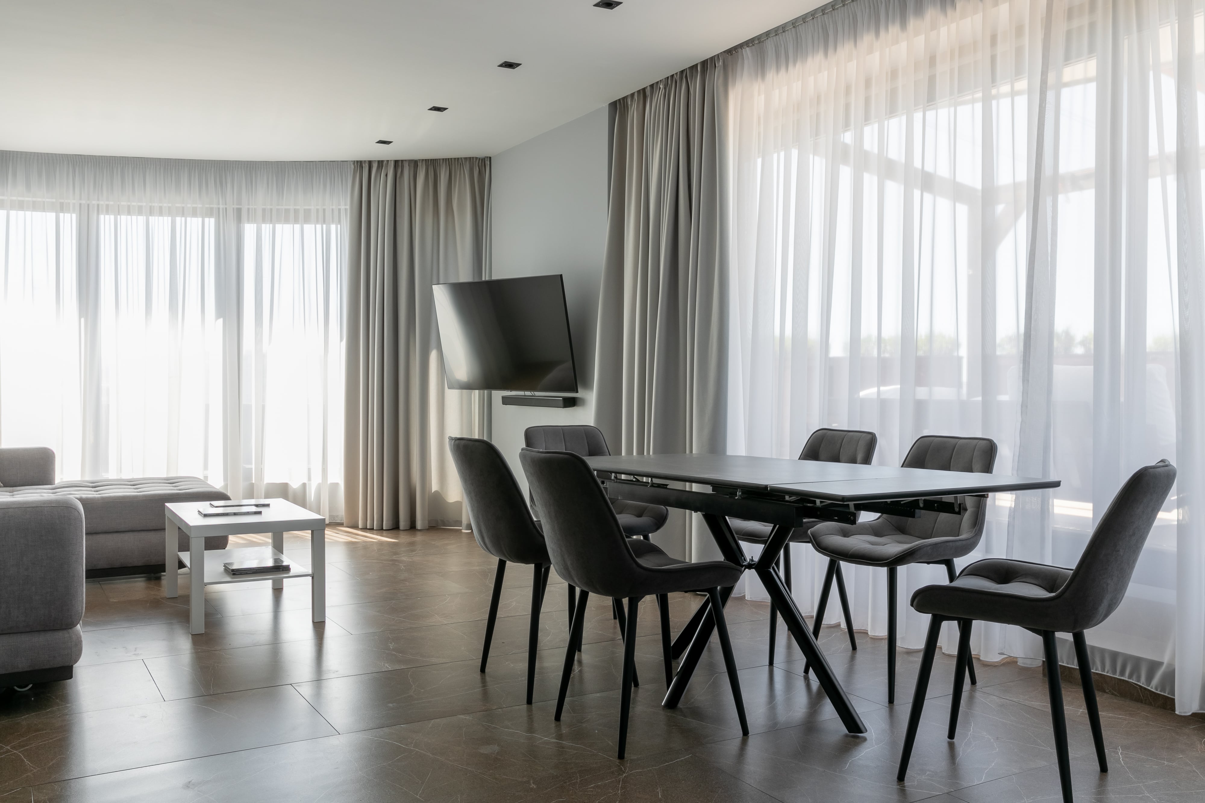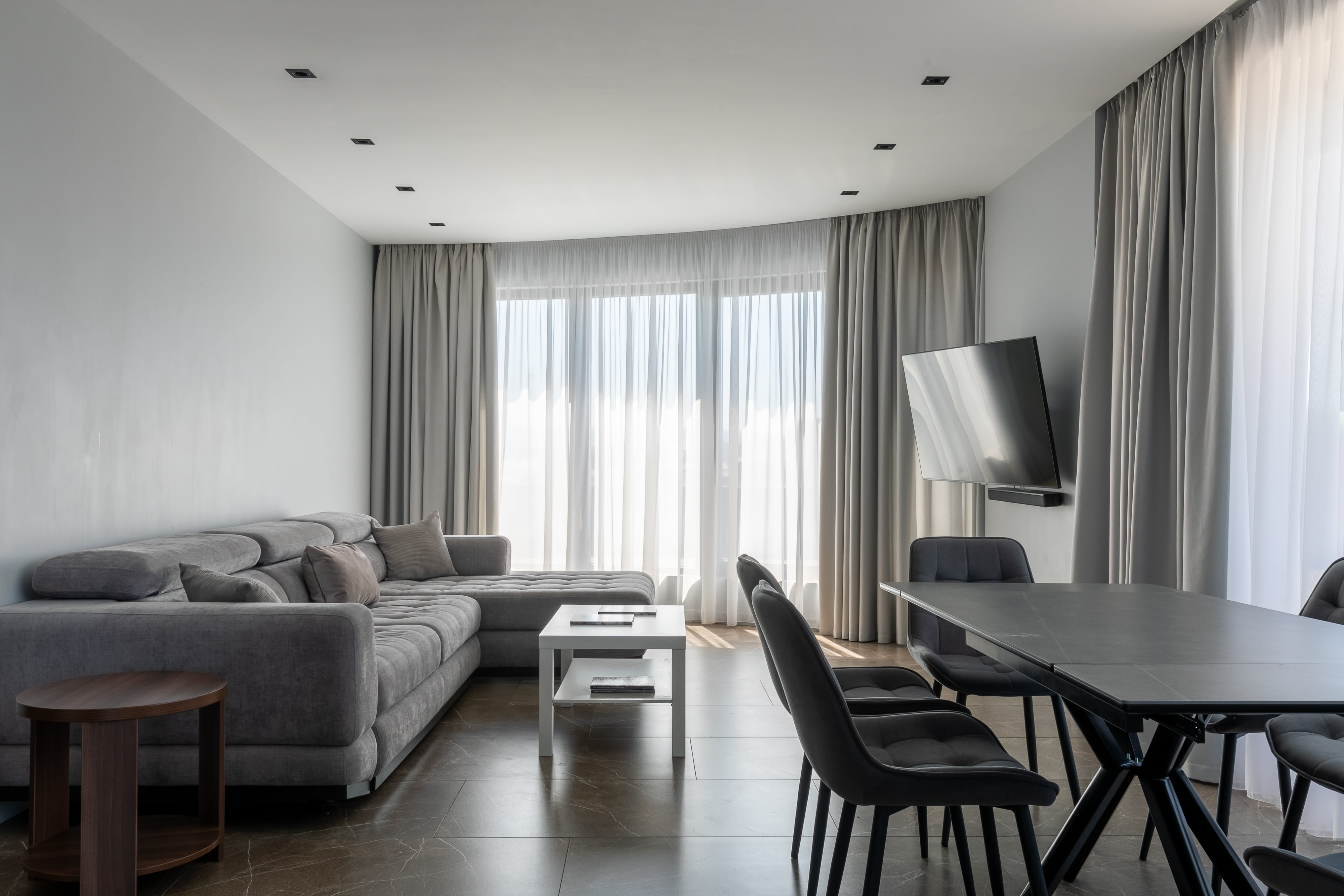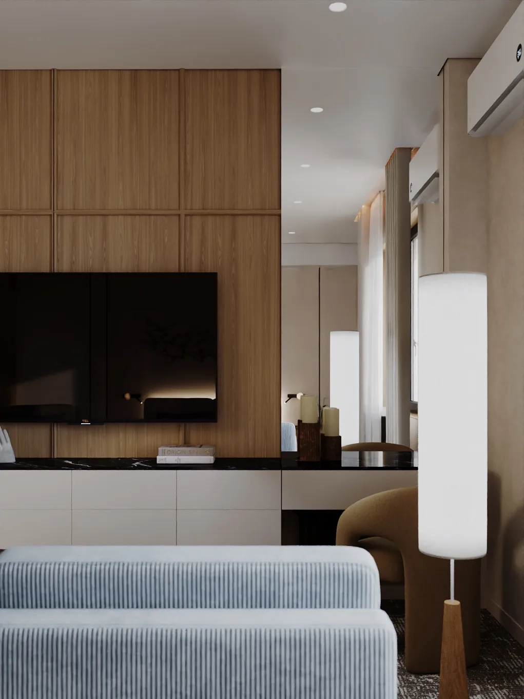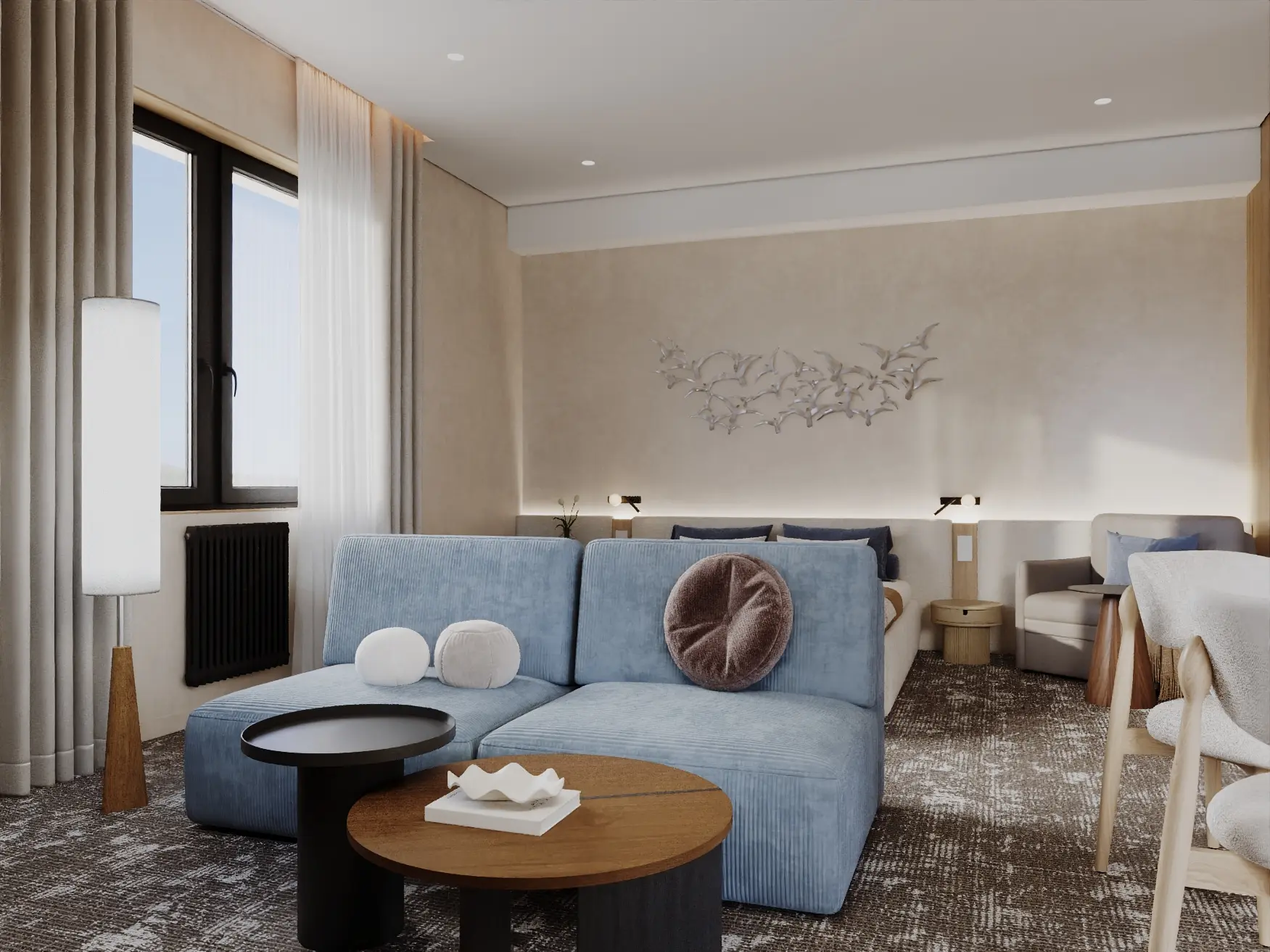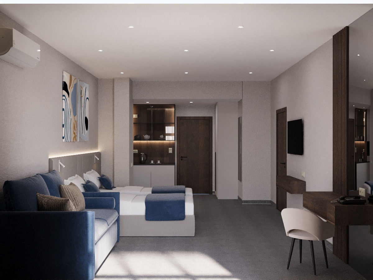Просторный однокомнатный номер с современным интерьером находится в корпусе № 2 (8-ми этажное здание пансионата).