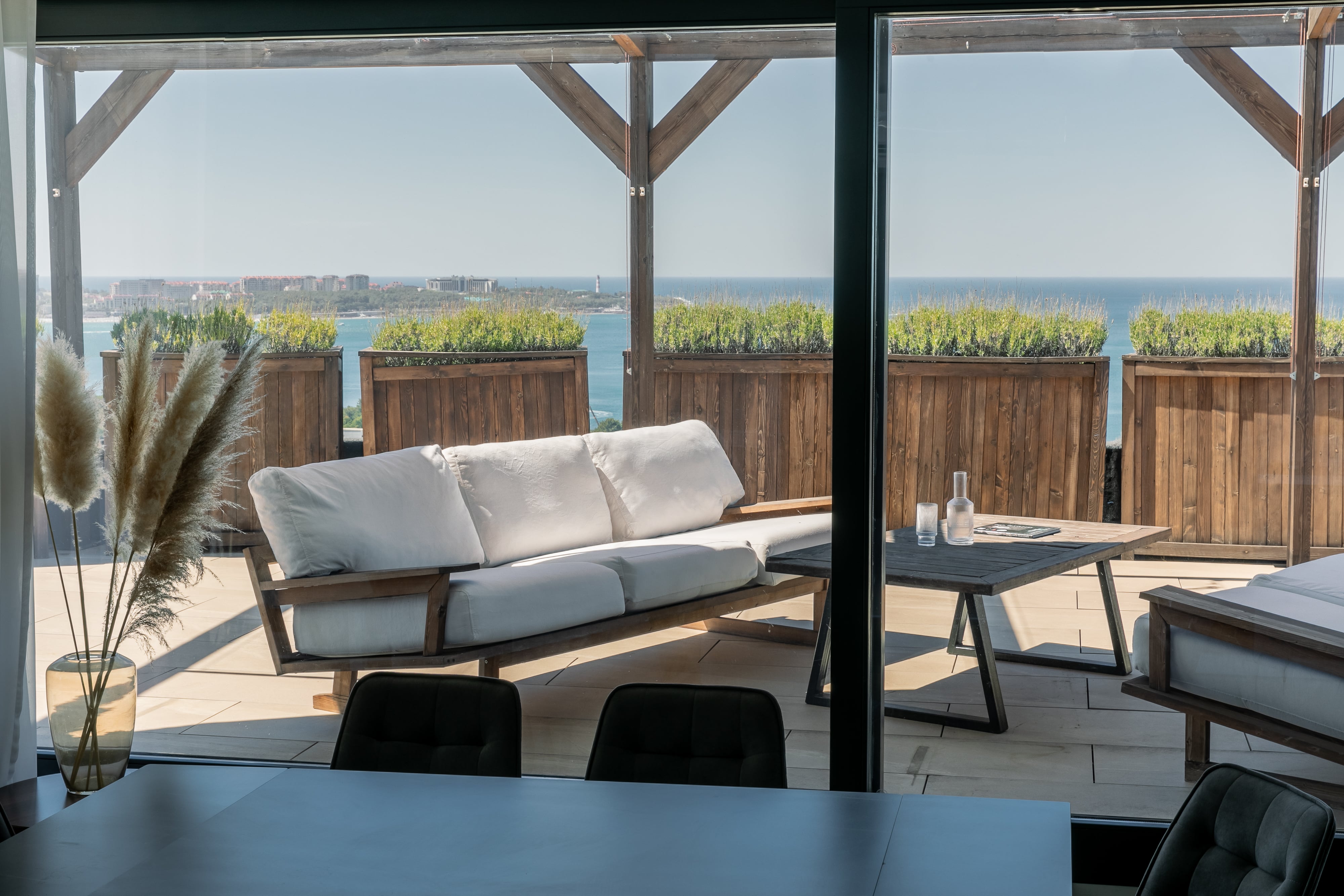 На террасе, с которой открывается панорамный вид на море и Геленджикскую бухту, расположен диван и столик для отдыха.
